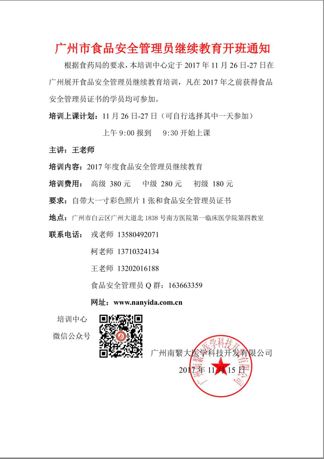 2017年11月份食品安全管理员(广州)继续教育开班通知