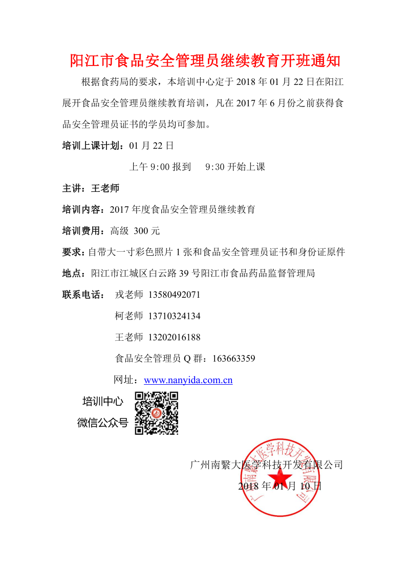 2018年01月份食品安全管理员(阳江)继续教育开班通知