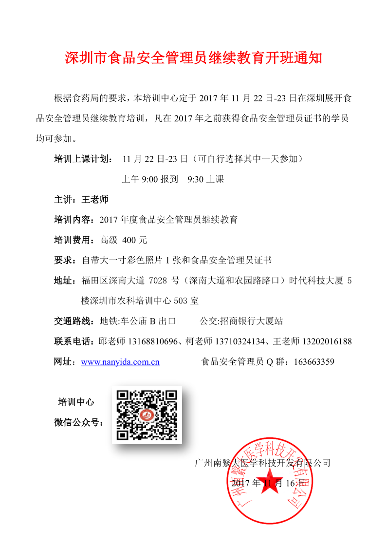 深圳2017年11月份食品安全管理员继续教育培训时间定于:11月22日-23日。