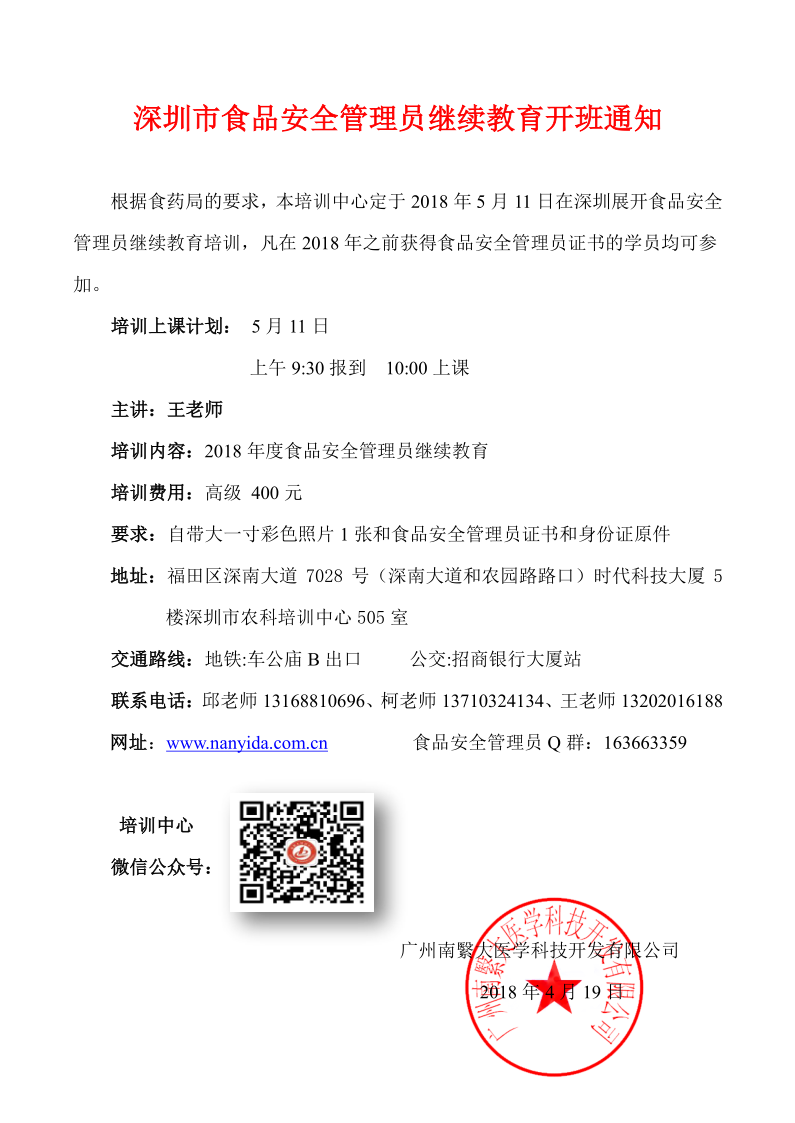深圳2018年05月份食品安全管理员继续教育培训时间定于:05月11日。